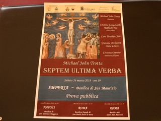 L'opera del Maestro Trotta verrà eseguita con il coro Troubar Clair e la Giovane Orchestra Note Libere in prima assoluta nazionale come prova pubblica, presso la Basilica di San Maurizio. Seguiranno altre tre date: il 26 marzo a Napoli, il 27 e 28 marzo a Roma. Le prime due esecuzioni saranno dirette dal Maestro Trotta mentre l'ultima dal direttore Cristina Orvieto. Per l'interpretazione imperiese gli interventi dei solisti sono affidati alle giovani voci di Cristina Longobardi e Raffaele Feo, mentre l'introduzione dei concerti a due noti attori Gennaro Squillace (a Napoli) e Pietro Conversano (a Roma).