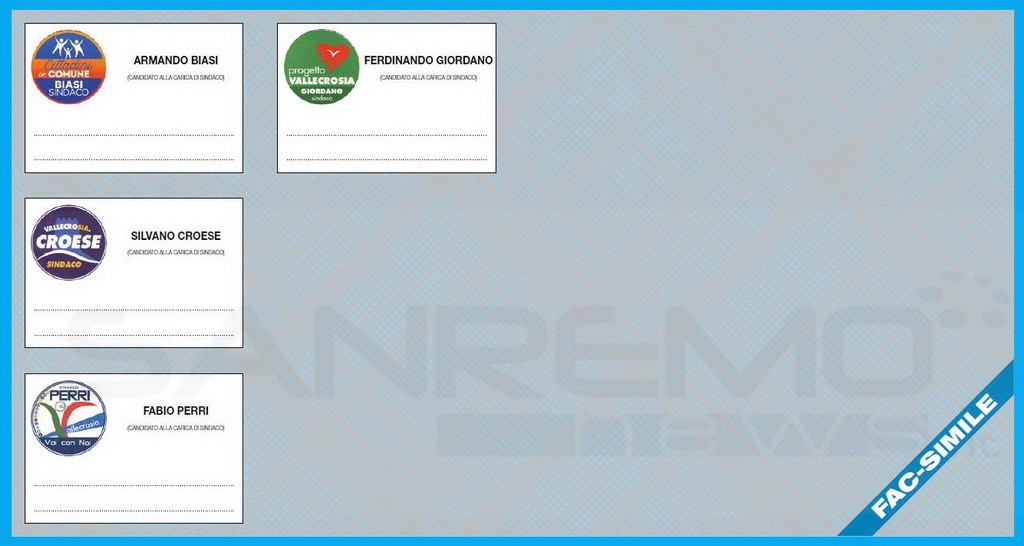 Stesso numero di candidati a Vallecrosia, con la riproposizione dell’attuale primo cittadino, Ferdinando Giordano, che si presenta con ‘Progetto Vallecrosia’. Si propongono anche due ex Sindaci. Silvano Croese ed Armando Biasi (Cittadini in Comune) e l’ex esponente dell’opposizione Fabio Perri (Voi con Noi).