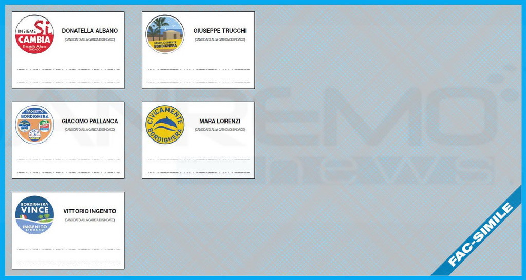 Anche quest’anno Bordighera offre 5 candidati a Sindaco anche se gli equilibri politici sono modificati. Si ripresenta Giacomo Pallanca, sostenuto da ‘Progetto Bordighera’ che vede al suo interno anche Forza Italia, Lega e Fratelli d’Italia; Vittorio Ingenito con Bordighera Vince, Giuseppe Trucchi (Semplicemente Bordighera), Donatella Albano (Insieme si Cambia) e Mara Lorenzi (Civicamente Bordighera).