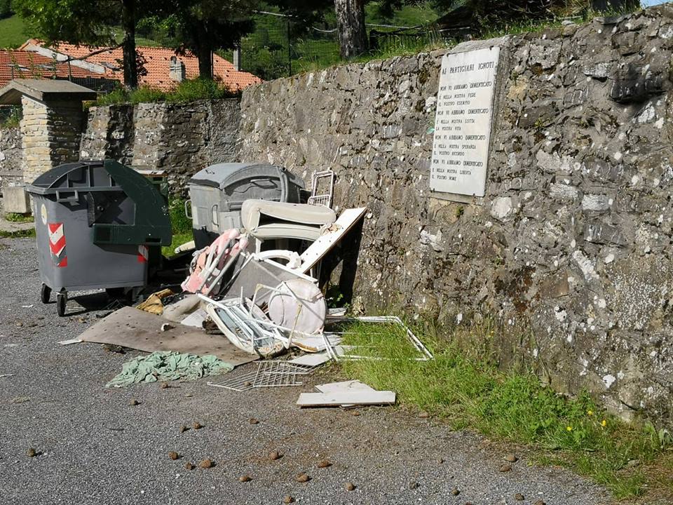 Vergogna a San Bernardo di Conio. Una discarica di ingombranti abbandonati a fianco a una targa in memoria dei Partigiani (Foto)