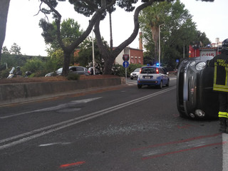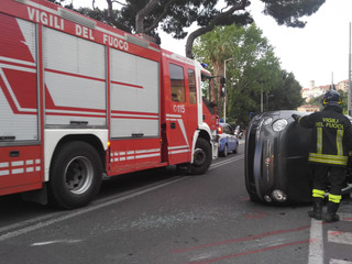 Mobilitazione di soccorsi sul lungomare Vespucci ad Imperia. Una Fiat 500 si è ribaltata in prossimità del passaggio a livello. Sul posto sono intervenute le squadre del