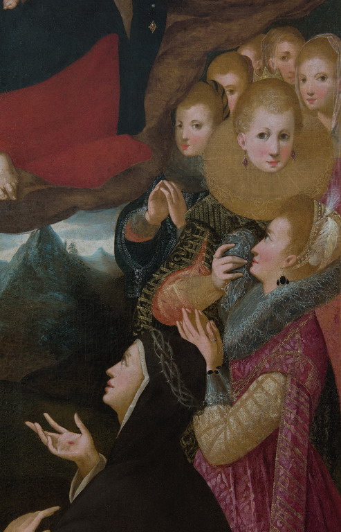 La tela del Rosario rappresenta la Vergine con il Bambino sospesa nel cielo e circondata da angioletti che recano cesti ricolmi di rosari destinati ad essere consegnati agli astanti in preghiera. In basso una serie di personaggi, maschili e femminili che si fronteggiano in gruppi dietro i Santi Domenico e Caterina da Siena, che si possono identificare con Filippo II di Spagna, San Pio V, Massimiliano II d'Asburgo e altri potenti che parteciparono alla Battaglia di Lepanto e nelle loro consorti. La scena è contornata dai Quindici Misteri del Rosario.