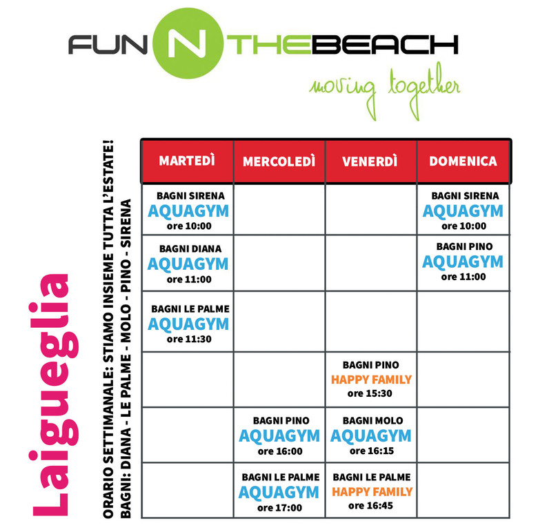 Le iniziative sono realizzate grazie anche al contributo di: Società Gestioni Municipali, Villa San Giuseppe e Bagni Paradiso (Diano Marina), Comune di San Bartolomeo al Mare, Consorzio QuiLagueglia. “Quest'estate il gruppo Fun on the Beach, capitanato da Roberto Nalbone, professionista da anni attivo nel settore di fitness e wellness, ha raccolto la sfida di proporre un ventaglio di attività in spiaggia, che coinvolga tutti. Dai più piccoli, fino ai membri anziani della famiglia, la squadra di Roberto non lascia nessuno ad annoiarsi sotto l’ombrellone” - spiegano i promotori del servizio.