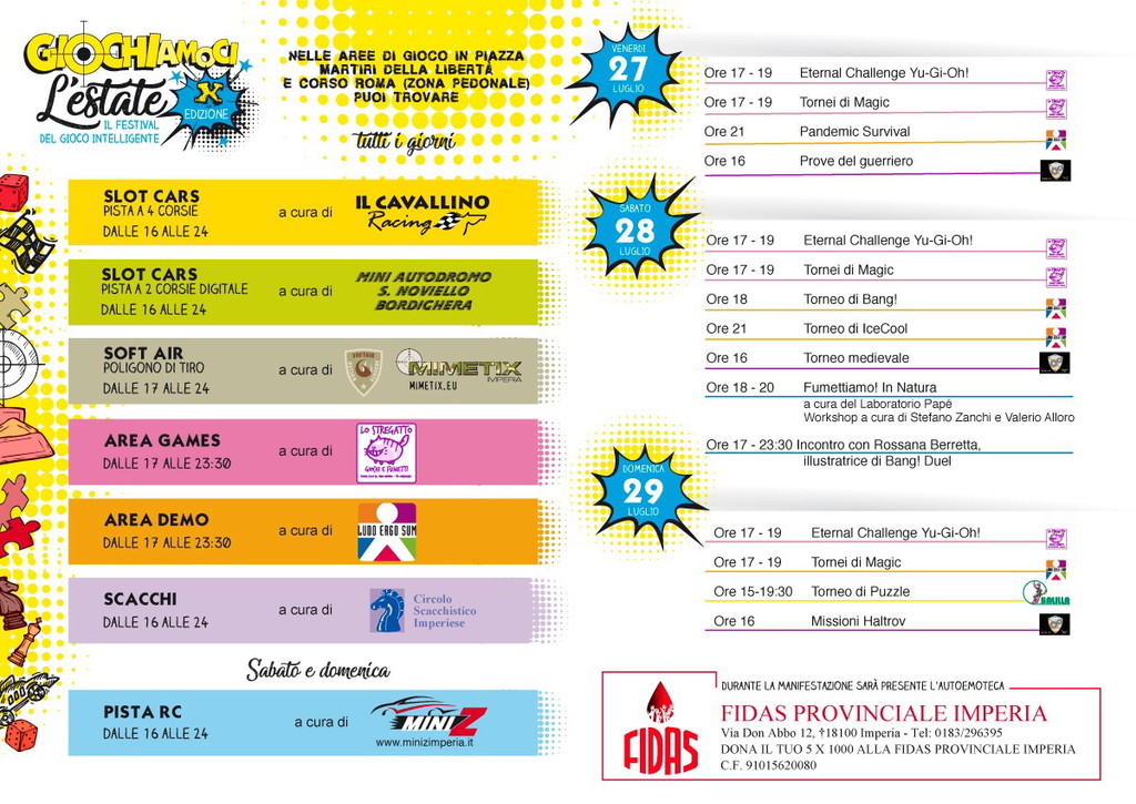 Tra le novità, la sezione scacchi, curata dal Circolo Scacchistico Imperiese, e di quella dedicata ai disegnatori di fumetti. In programma dimostrazioni e tornei di puzzle e di vari giochi di carte quali Yu-gi-oh, Bang!, Pandemic, Magic, Medievale e Icecool. A disposizione un poligono per il soft air e piste di slot cars e auto Rc. Da segnalare due appuntamenti previsti per sabato 28: dalle ore 18 alle 20 il workshop “Fumettiamo in natura”, a cura di Stefano Zanchi e Valerio Alloro (Laboratorio Papè), e in due momenti (ore 17.30-23.30) l’incontro con l’illustratrice di Bang! Rossana Berretta. Inoltre eventi modellistici.
