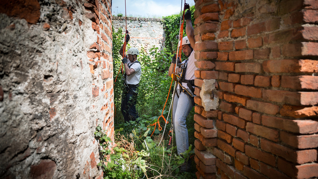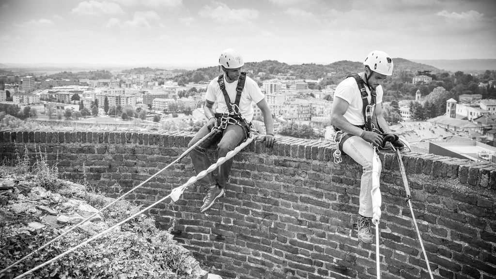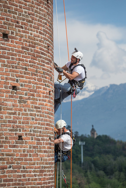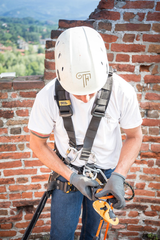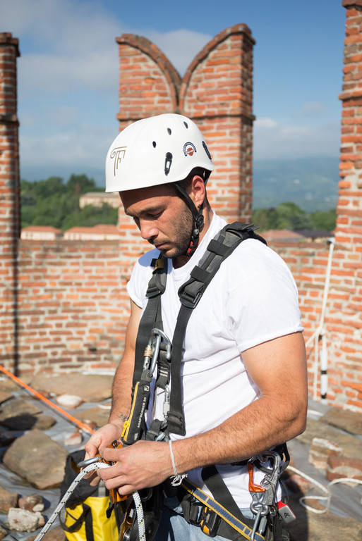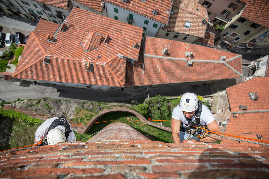 E per quanto riguarda la specialità della ditta, cioè il Restauro in Quota, ribadiscono Elena e Alberto Formento: “Noi e tutto il personale che lavora con noi non siamo degli acrobati o degli strani supereroi, ma dei professionisti che sanno quello che fanno. I restauratori certificati, in totale sicurezza e rispettando ogni requisito di legge, utilizzano i sistemi su fune per operare in contesti di difficile accesso. Oltre ad essere tutti preparati su queste tecniche, ognuno di loro ha la propria specializzazione: dai tecnici delle coperture agli operai specializzati ed ai restauratori che intervengono su intonaci e superfici pittoriche”.