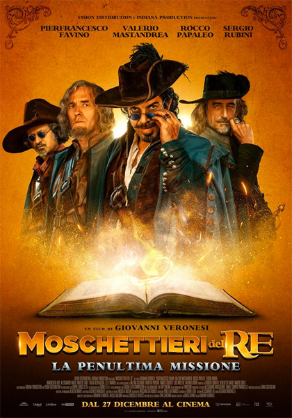 - MOSCHETTIERI DEL RE – ore 19.30 - 21.30 – di Giovanni Veronesi - con Pierfrancesco Favino, Valerio Mastandrea, Sergio Rubini, Rocco Papaleo, Margherita Buy – Commedia - "I leggendari spadaccini, D’Artagnan, Athos, Aramis e Porthos oggi sono un allevatore di bestiame sgrammaticato, un castellano lussurioso, un frate indebitato e un locandiere ubriacone, che per amor patrio saranno di nuovo moschettieri. Un po' attempati, cinici e disillusi, ma sempre abilissimi con spade e moschetti, vengono richiamati all'avventura dopo oltre vent’anni dalla Regina Anna per salvare la Francia dalle trame ordite a corte dal perfido Cardinale Mazzarino con la sua cospiratrice Milady…”