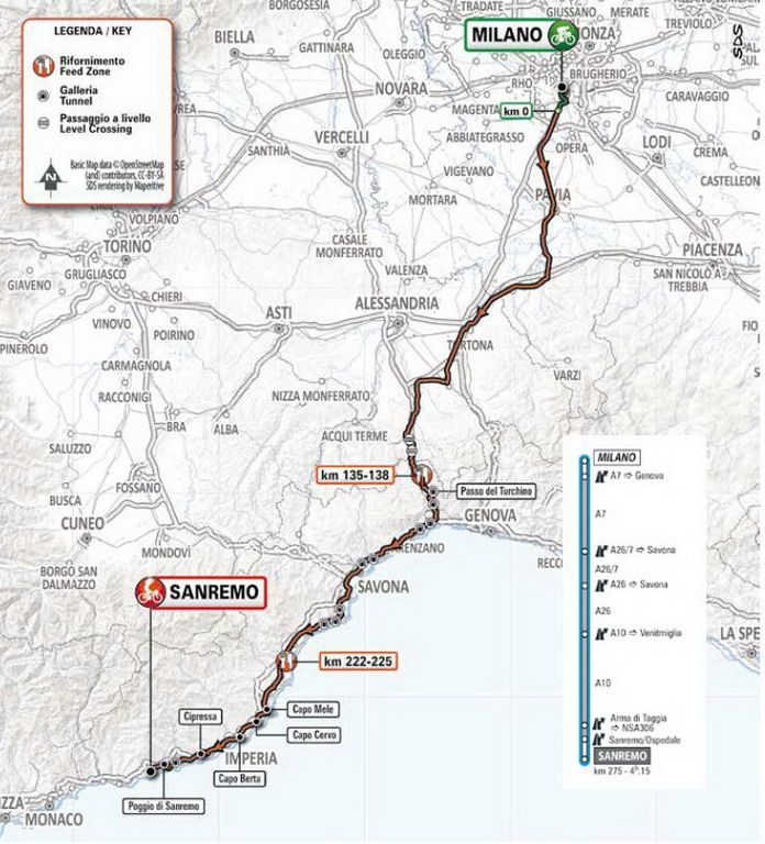 Resterà chiusa la strada provinciale che dal bivio per Cipressa, all'altezza del Km. 654+520 dell'Aurelia, si ricongiunge alla stessa strada in corrispondenza del Km. 658+680 in località Aregai di Cipressa. La strada statale Aurelia resterà chiusa alla circolazione a partire dalle 14 a Sanremo, dall'imbocco della salita Via Duca D'Aosta in direzione bivio Poggio/Ceriana/Baiardo, fino a Via Roma ove è fissato il traguardo. Sono esclusi dal predetto divieto i mezzi di soccorso. Dalle 8 alle 18 della stessa giornata sarà interdetto, in entrambi i sensi di marcia, il transito ai mezzi pesanti di massa superiore a 7,5 t. sul tratto dell'Aurelia compreso tra Capo Cervo e Ventimiglia. Questa ultima prescrizione non riguarderà i mezzi di trasporto pubblico.