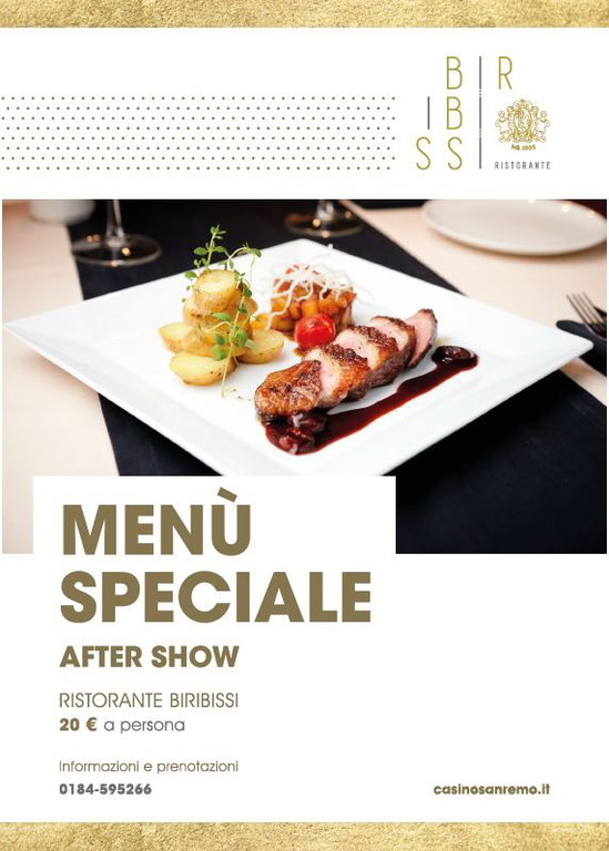 Enrico Brignano torna dopo due anni nel Teatro dell’Opera richiestissimo dagli ospiti della Casa da Gioco. Le prevendite si stanno moltiplicando e sicuramente risulterà interessante la nuovissima proposta per gli eventi Vip nel Teatro dell’Opera. Nell’ambito della nuova offerta di intrattenimento e di ristorazione, in collaborazione con Elior, il Casinò, infatti, propone la cena After show a un prezzo particolarmente accattivante € 20. Verrà creato, evento dopo evento, un menu prelibato, in linea con la grande ristorazione del Casinò per per prolungare la serata dal Teatro dell’Opera al ristorante Biribissi. Questa la proposta per la serata del 11 aprile: Piatto unico Paccheri con pomodorini e ricotta,Tagliata di manzo su carosello di verdure croccanti, Calice di vino, Acqua e Caffè. Costo € 20.