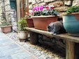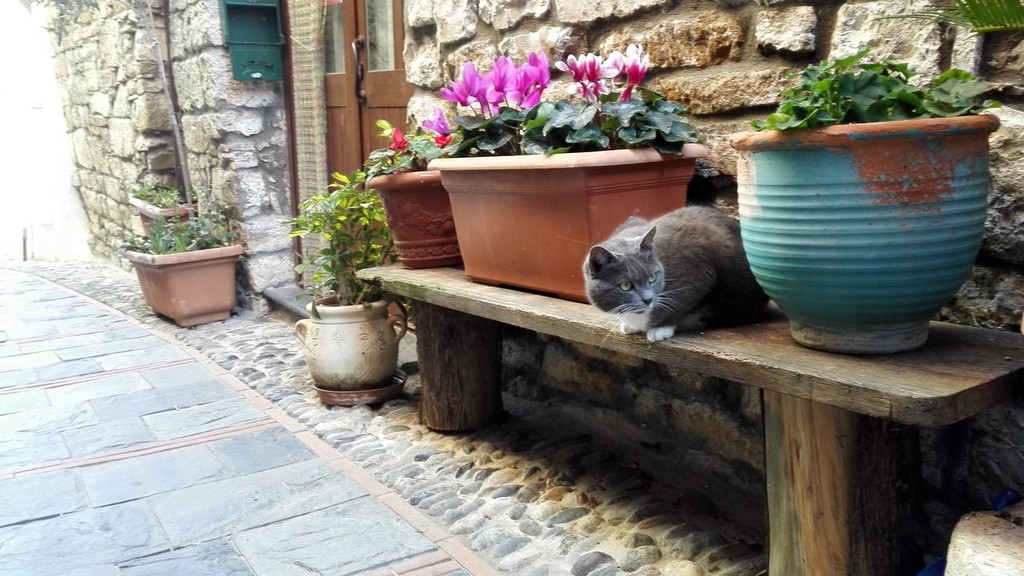 Ok, ma come mai queste forme quasi militari? A metà del Cinquecento il Ponente Ligure fu devastato dalle incursioni dei pirati barbareschi, feroci predoni provenienti dal nord Africa che colpivano la costa e il primo entroterra. Visto che queste terre erano povere, il bottino consisteva soprattutto in esseri umani, da rapire e vendere ai mercati degli schiavi o da riscattare. Il litorale di San Lorenzo, privo di difese naturali, diventò una delle mete preferite dai barbareschi. I paesi della zona si videro così costretti a organizzarsi, costruendo edifici per l'avvistamento e la difesa. La chiesa di San Pietro, forse per la sua solidità o forse per la sua posizione, venne modificata perché diventasse anche una piccola fortezza, con le caratteristiche aggiunte tipiche degli edifici militari dell'epoca. Sopra l'ingresso principale notiamo ad esempio una piombatoia, da dove si potevano far cadere addosso al nemico pietre o liquidi bollenti. Negli angoli in alto possiamo vedere quello che resta dei posti di guardia coperti, sul tetto si intuisce lo sviluppo del camminamento di ronda. Davvero notevole anche il portale fortificato, che risale proprio al Cinquecento. La chiesa non perse comunque la sua funzione religiosa, ne acquistò semplicemente anche una militare. Un caso piuttosto raro. Dopo avere ammirato la chiesa fortezza di San Pietro possiamo risalire verso la piazza, prendendoci il nostro tempo per visitare altri carruggi colonizzati da una folta schiera di mici.