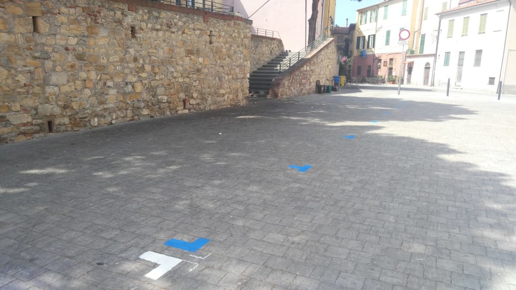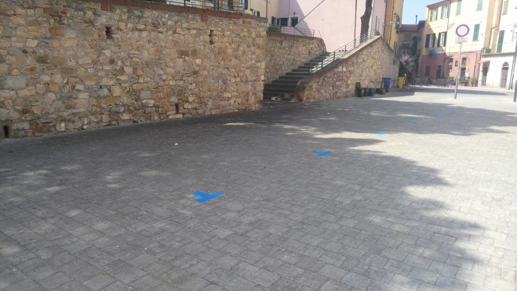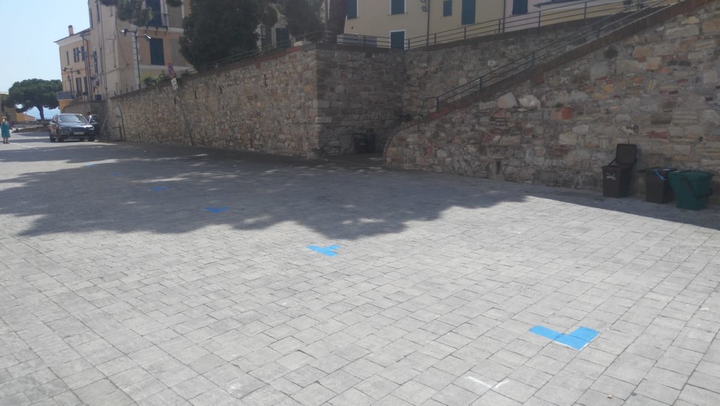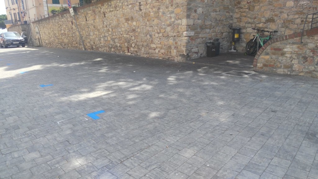 Ecco i posteggi in piazza Parasio. Come annunciato, è stata inserita oggi la nuova segnaletica orizzontale con il disegno di 15 stalli blu e bianchi. Non le consuete strisce, ma i semplici angoli che delimitano gli spazi di sosta.