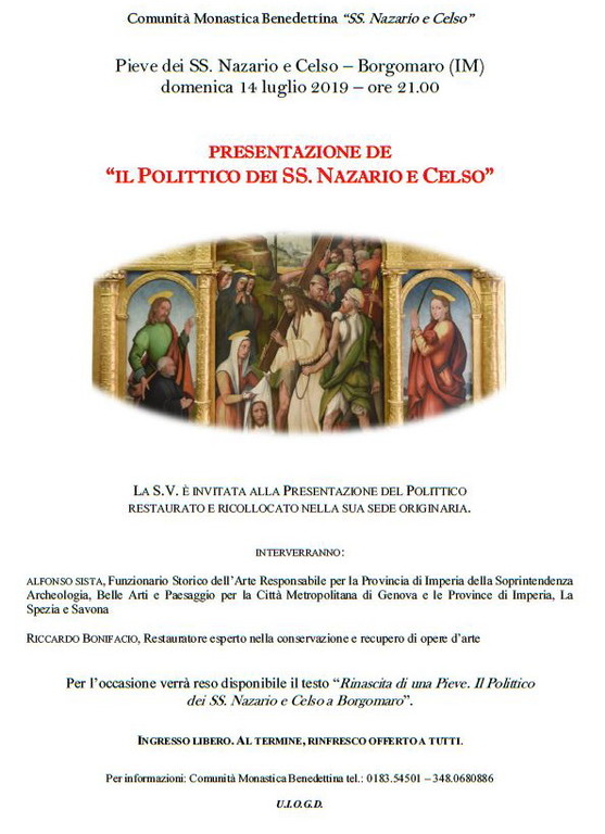 Nella serata di domenica 14 luglio 2019, alle ore 21.00, a Borgomaro, nella Pieve dei SS. Nazario e Celso, sede della omonima Comunità Monastica Benedettina, si terrà la presentazione del Polittico dei SS. Nazario e Celso.