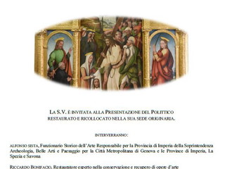 A condurre la serata e illustrare in dettaglio caratteristiche e valore del Polittico saranno il dott. Alfonso Sista (Funzionario Storico dell’Arte Responsabile per la Provincia di Imperia della Soprintendenza Archeologia, Belle Arti e Paesaggio per la Città Metropolitana di Genova e le Province di Imperia, La Spezia e Savona) e Riccardo Bonifacio (Restauratore esperto nella conservazione e recupero di opere d’arte).
