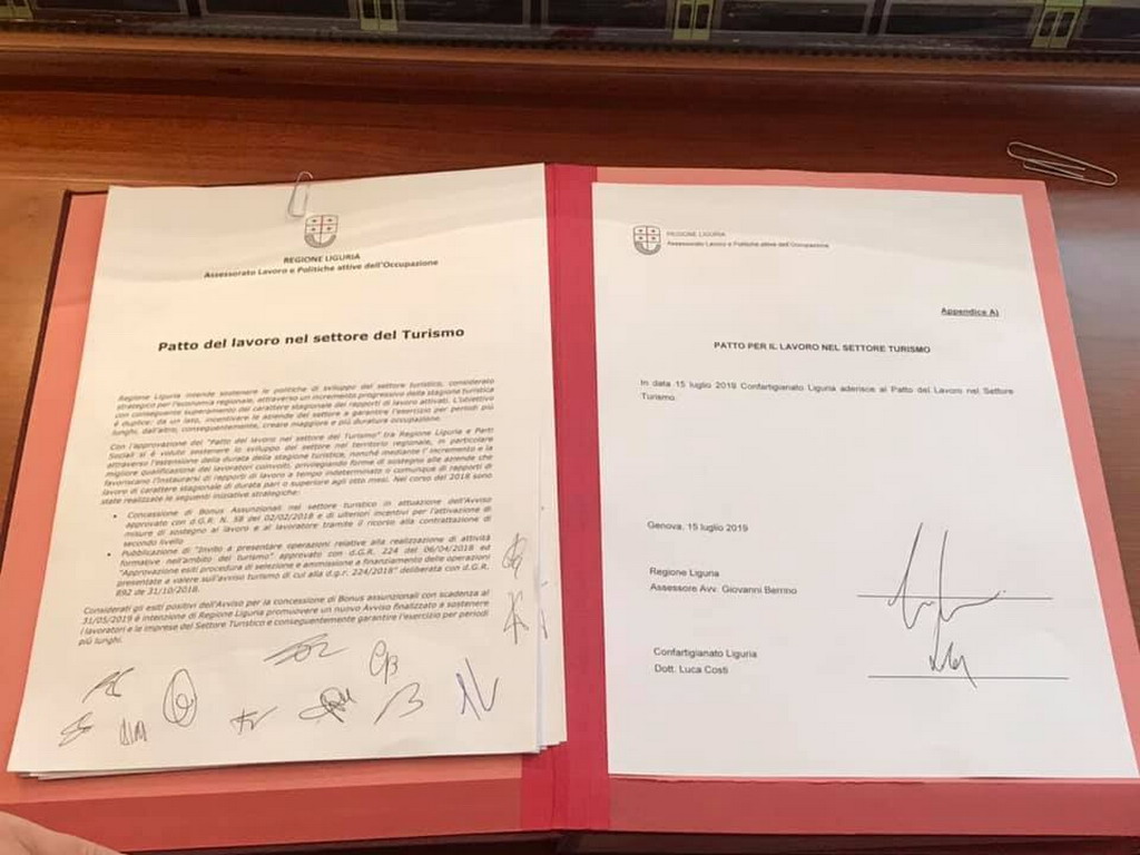 “Dopo gli ottimi risultati del primo accordo, con mille contratti della durata minima di otto mesi, sottoscriviamo insieme il nuovo Patto per il lavoro, allargato per la prima volta anche ai settori delle gelaterie e delle pasticcerie. Un'opportunità per due settori importanti della nostra economia regionale”: è questo il commento di Gianni Berrino, assessore al Lavoro e Turismo della Regione Liguria e di Luca Costi, segretario regionale di Confartigianato Liguria, durante la sottoscrizione del nuovo Patto del lavoro nel settore del Turismo.