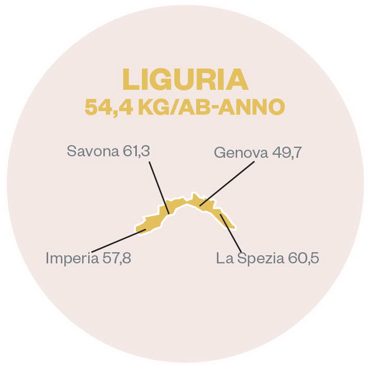 Savona si conferma la provincia più virtuosa con oltre 61 chilogrammi raccolti per abitante; la provincia di Genova mantiene il primato regionale per volumi di raccolta (oltre 42mila tonnellate) ma a livello di pro capite i margini di miglioramento sono ancora ampi (49,7 kg/ab). Sempre per volumi di raccolta crescono in maniera significativa le provincie di Imperia e La Spezia, rispettivamente del 5,9% e del 5,5%.