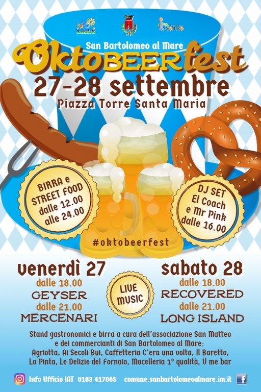 Ottimo avvio ieri per la prima giornata della OktoBeerFest di San Bartolomeo al Mare: grande affluenza di pubblico e molta soddisfazione per gli organizzatori. Si prosegue oggi, con stand gastronomici, birra a fiumi e musica in piazza. L'evento è organizzato dal Centro Sociale Incontro, con la collaborazione dell'Ufficio IAT del Comune e la partecipazione dell'Associazione San Matteo e dei commercianti di San Bartolomeo al Mare (Agriotta, Ai Secoli Bui, Caffetteria C'era una volta, Il Baretto, La Pinta, Le Delizie del Fornaio, Macelleria 1° qualità, U me Bar).