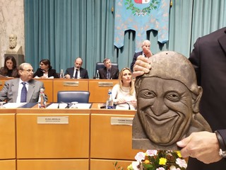 Il primo cittadino ha spiegato: "Il professor Gianni Ballerio, accompagnato dal consigliere Fabrizio Risso, ha donato al comune di Imperia un pregevole bassorilievo in bronzo raffigurante Grock a una condizione che venga apposto in un luogo di spettacolo che sarà il rinnovato teatro Cavour.