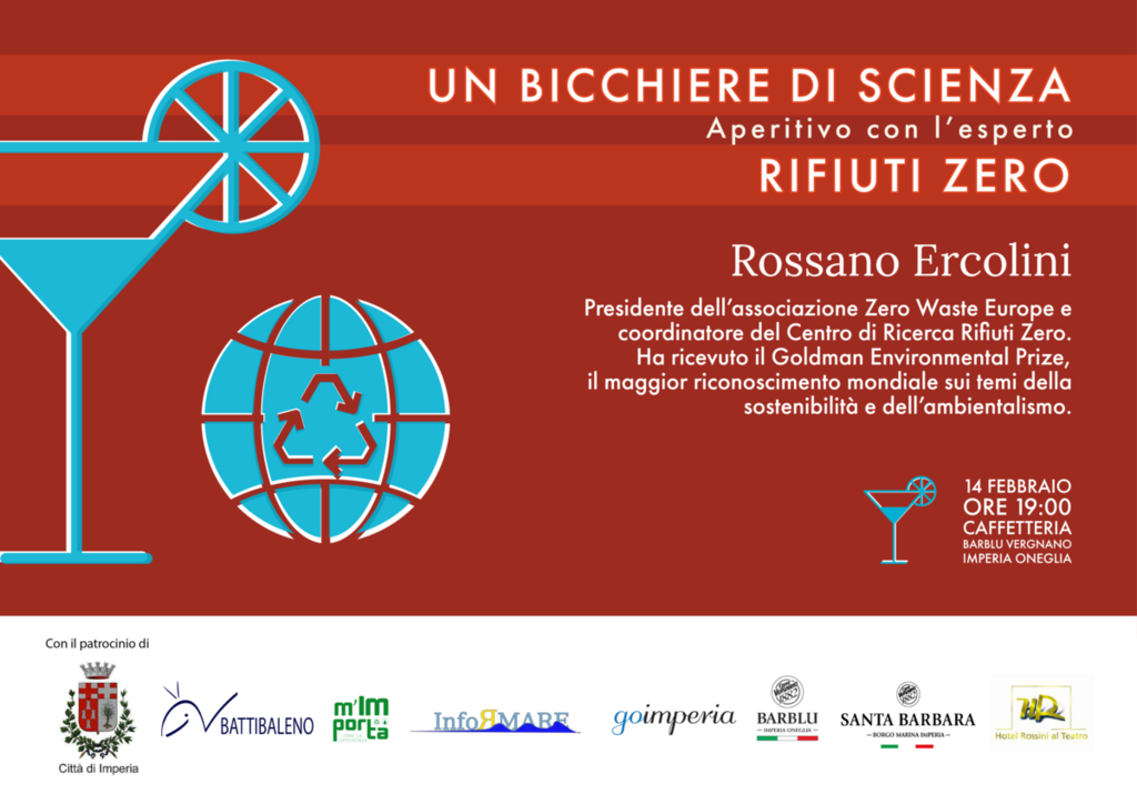 “Un bicchiere di scienza, aperitivo con l'esperto" ritorna venerdì alle 19 presso la caffetteria Barblu Vergnano di Imperia con “Rifiuti Zero – Dieci passi per la rivoluzione ecologica”. Parteciperà all’incontro Rossano Ercolini, presidente dell’associazione Zero Waste Europe e coordinatore del Centro di Ricerca Rifiuti Zero, insignito del prestigioso Goldman Environmental Prize, il maggior riconoscimento mondiale sui temi della sostenibilità e dell’ambientalismo.