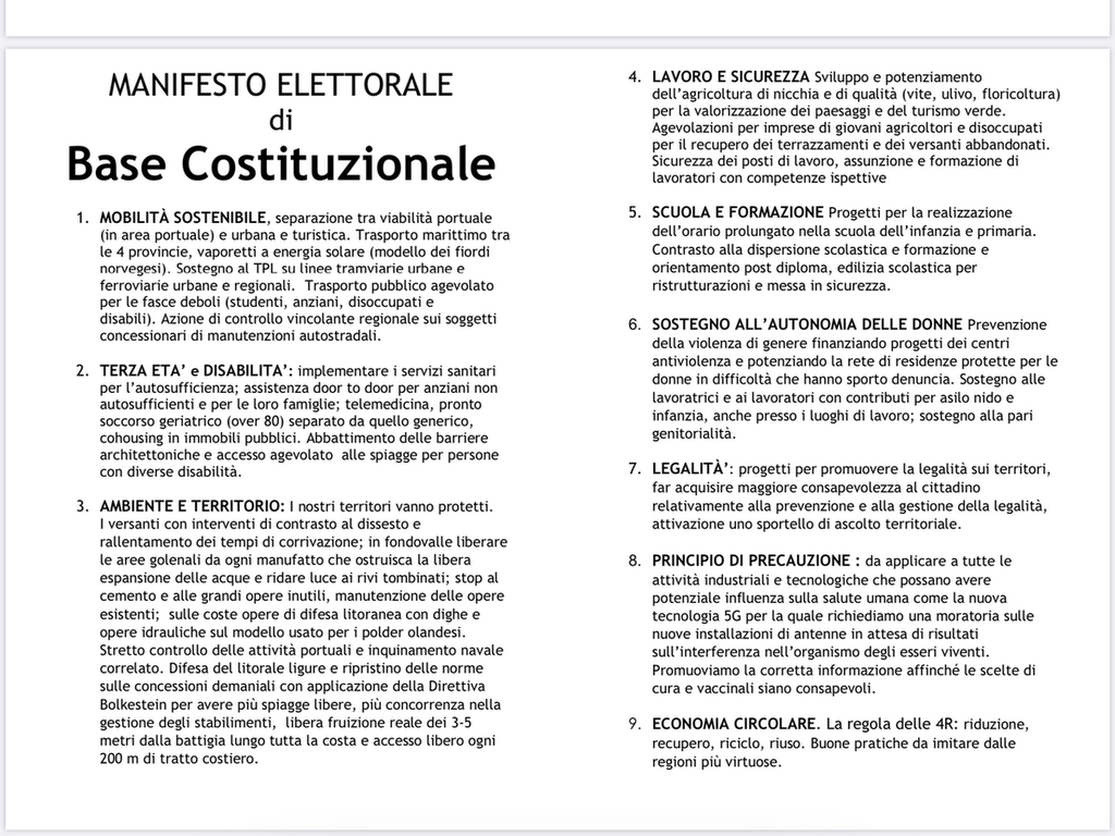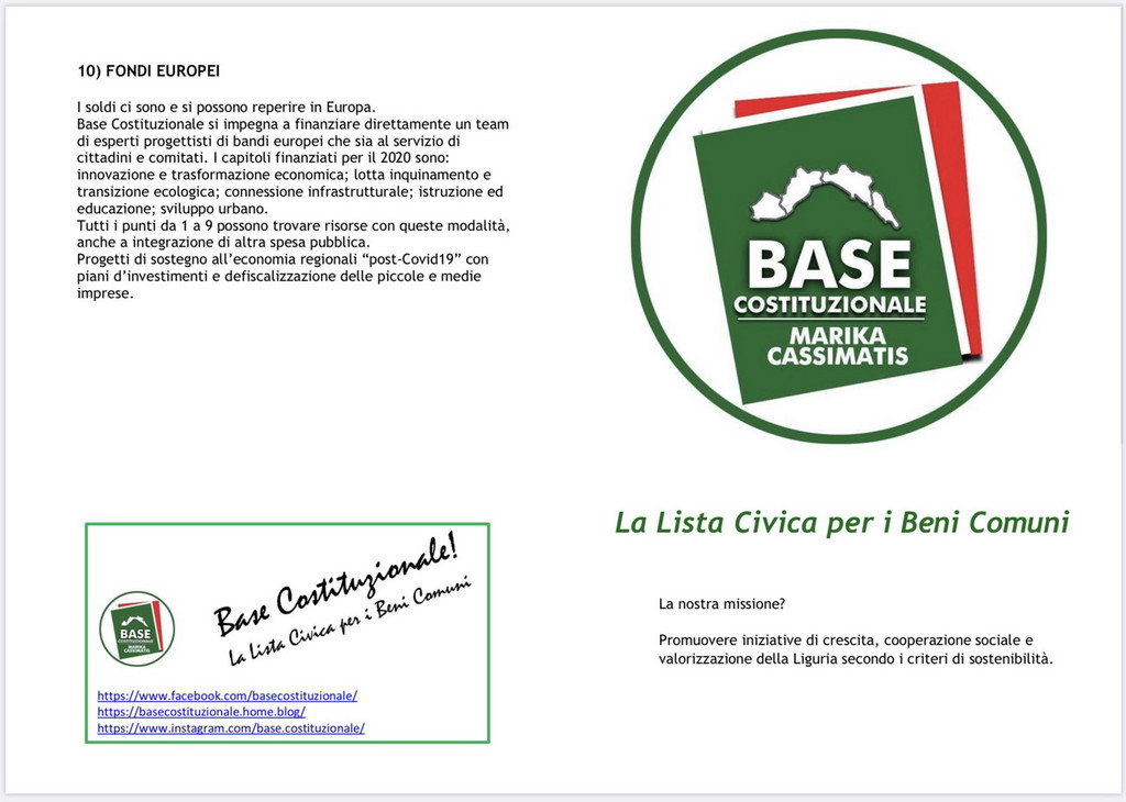 Mercoledì prossimo, dalle ore 9.30 alle 12.30, all’ingresso del mercato annonario di Sanremo, Marika Cassimatis e Stefania Asplanato raccoglieranno le firme necessarie per la presentazione formale della lista 'Base Costituzionale', per le elezioni regionali del 20 e 21 settembre 2020.