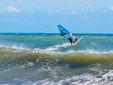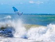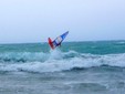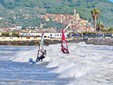 Il forte vento – erano previste possibili raffiche anche oltre i 100 km/h – e le onde alte più di due metri non hanno impedito ai campioni Thomas Traversa e Alex Mussolini di scendere in mare per esibirsi con evoluzioni e salti spettacolari.