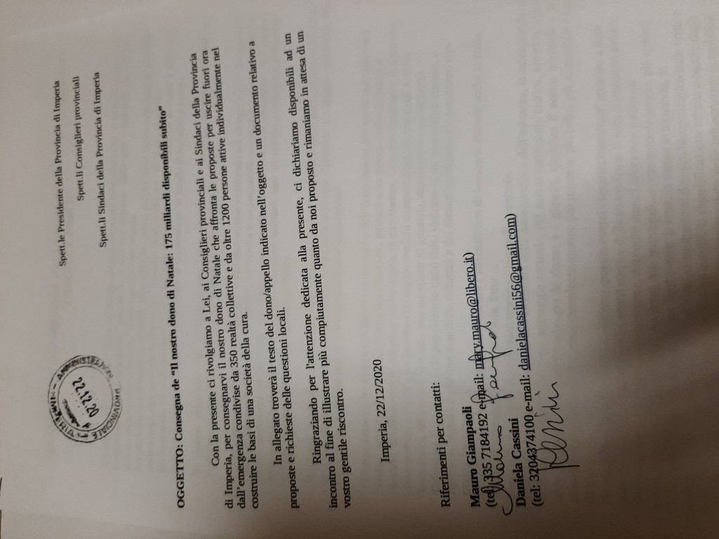 A livello locale, questa mattina è stato consegnato presso la Provincia ad Imperia il “Dono di Natale” con un allegato riguardante una priorità territoriale.