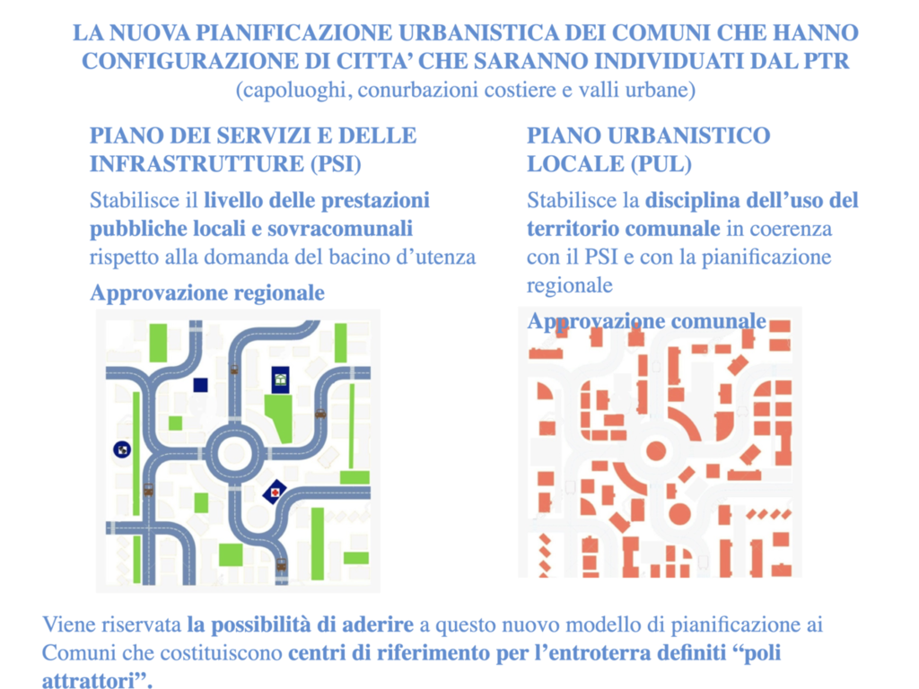 - il Piano Urbanistico Locale, che disciplinerà l’uso del territorio in coerenza con il piano dei servizi e delle infrastrutture e sarà di esclusiva competenza dei comuni stessi, senza alcun passaggio amministrativo in Regione. Viene inoltre riservata la possibilità di aderire a questo nuovo modello di pianificazione ai comuni che costituiscono centri di riferimento per l’entroterra e che vengono definiti dalla legge “poli attrattori”. Per tutti gli altri comuni resterà valido il modello di pianificazione del piano urbanistico comunale, come già ad oggi disciplinato dalla legge urbanistica regionale.