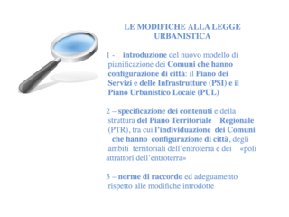 Le modifiche riguardano i comuni a cui il Piano Territoriale Regionale, in corso di definizione, e a seguito del confronto con il territorio, attribuirà la qualifica di città (capoluoghi, conurbazioni costiere e valli urbane) e per i quali il piano urbanistico comunale sarà sostituito da due strumenti: