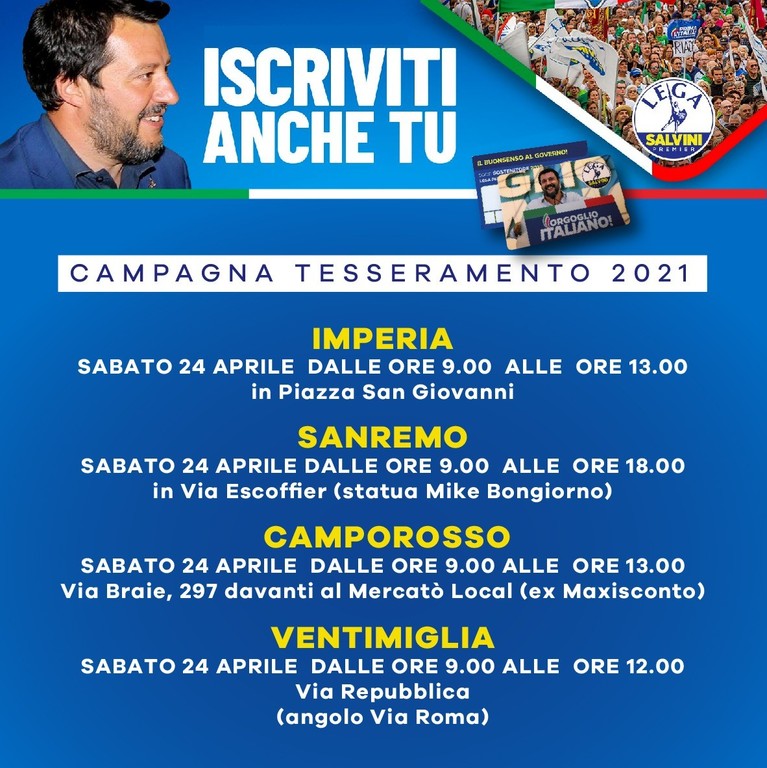 "La campagna tesseramento 2021 per la Lega è in piena attività. Domani in provincia di Imperia sarà possibile incontrare i militanti in una serie di gazebo sul territorio da Imperia a Sanremo, da Ventimiglia a Camporosso. Una mobilitazione nel pieno rispetto delle norme sanitarie per confermare la vocazione della Lega, sempre tra la gente. L'elenco in costante aggiornamento sui profili Facebook e Telegram della Lega Liguria".