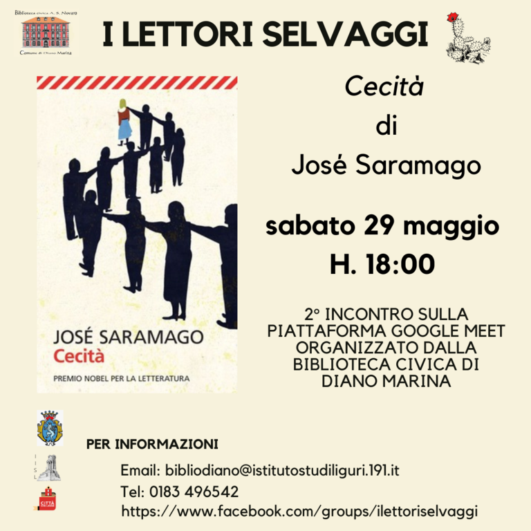 Il prossimo appuntamento è previsto per sabato 29 sulla piattaforma Google Meet alle 18 con protagonista il romanzo Cecità del Premio Nobel per la Letteratura 1998 José Saramago, oggi particolarmente di attualità.