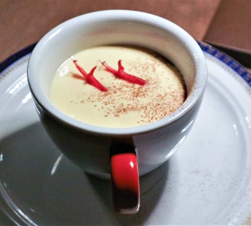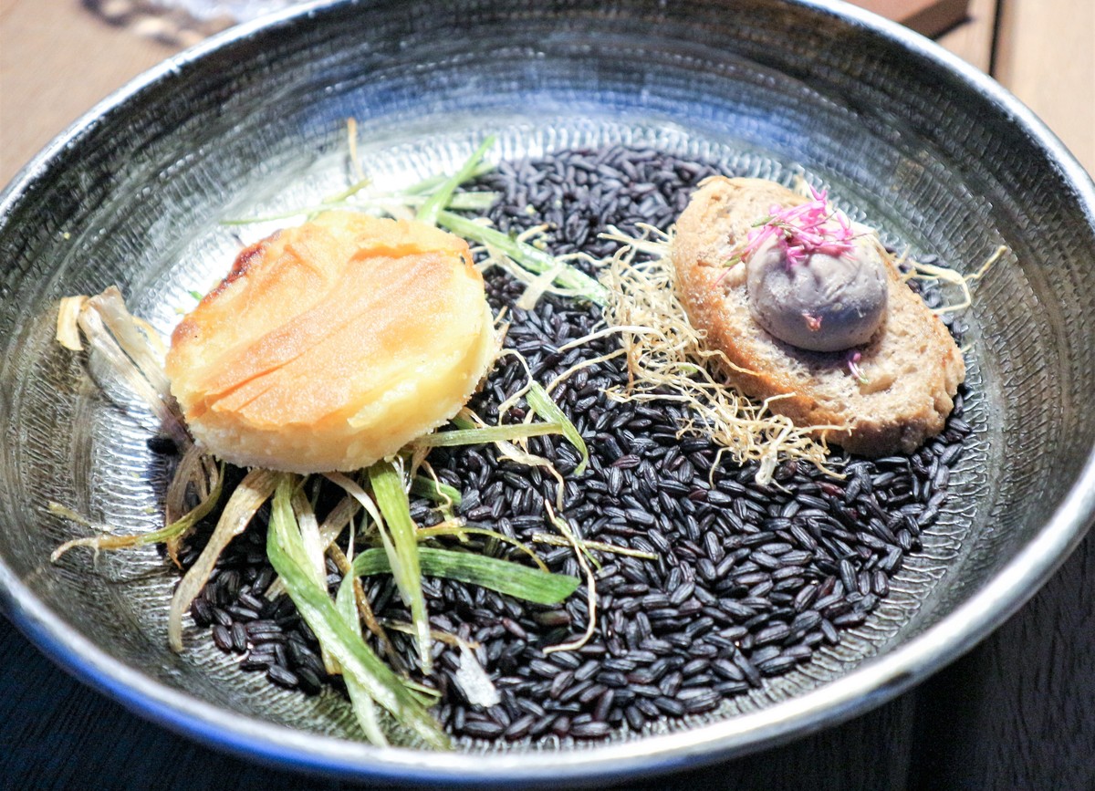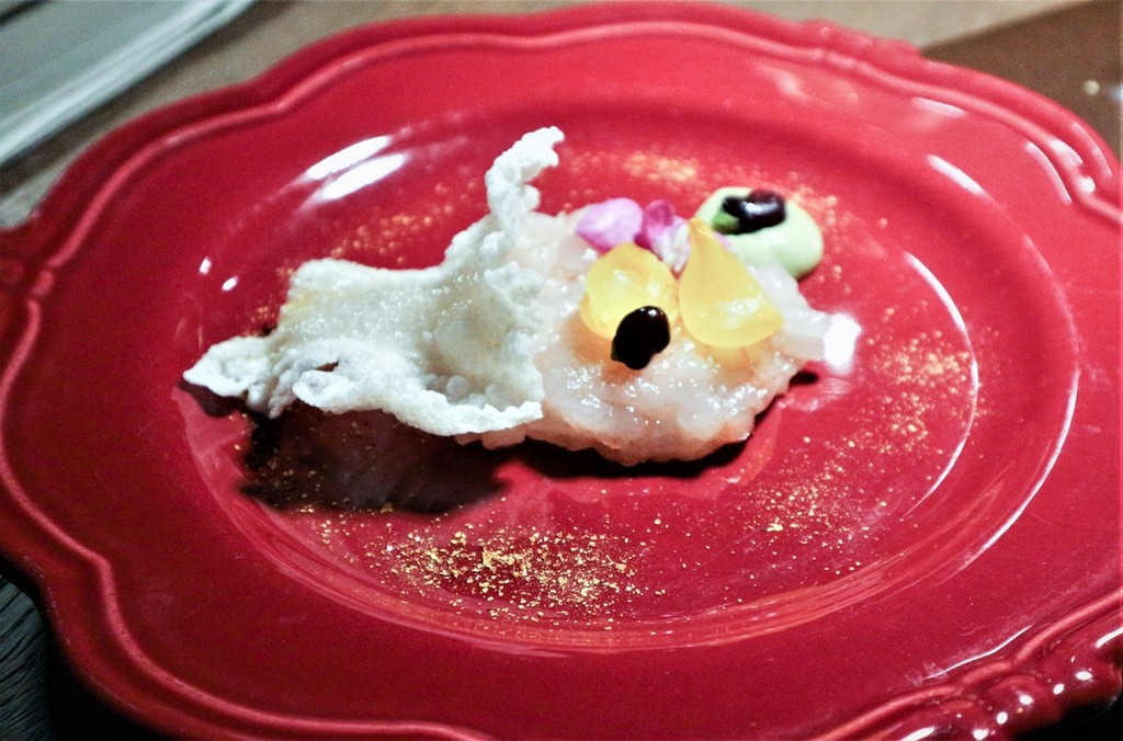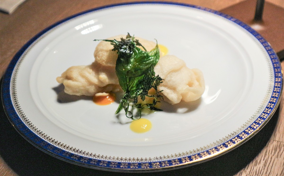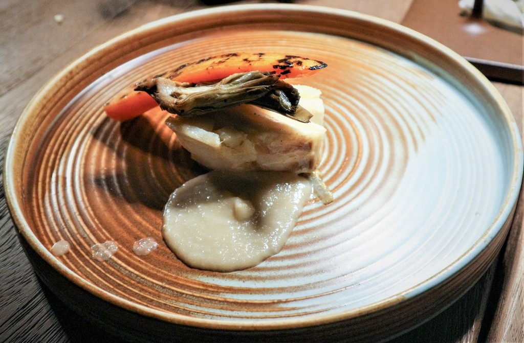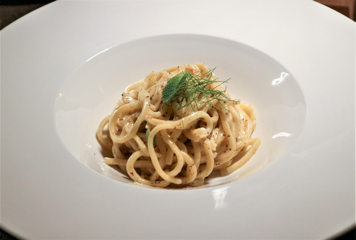 lo Spaghetto alla chitarra con crema leggera di Bottarga, fatta dallo chef e con foglie di erbe selvatiche, il Cubetto di mare affumicato con crema di cipolla e carciofi alla brace e come dessert il Cremoso ai fiori d'arancia. L’intero menù costa € 48 sempre senza le bevande.