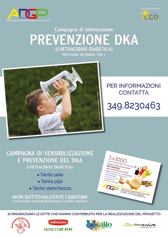 L’associazione Diabete Giovanile Ponente APS ha dato il via a una campagna di informazione per la prevenzione della chetoacidosi diabetica nel diabete tipo1 con una serie di volantini da distribuire sul territorio ligure per far conoscere i sintomi che si presentano all’esordio della malattia.