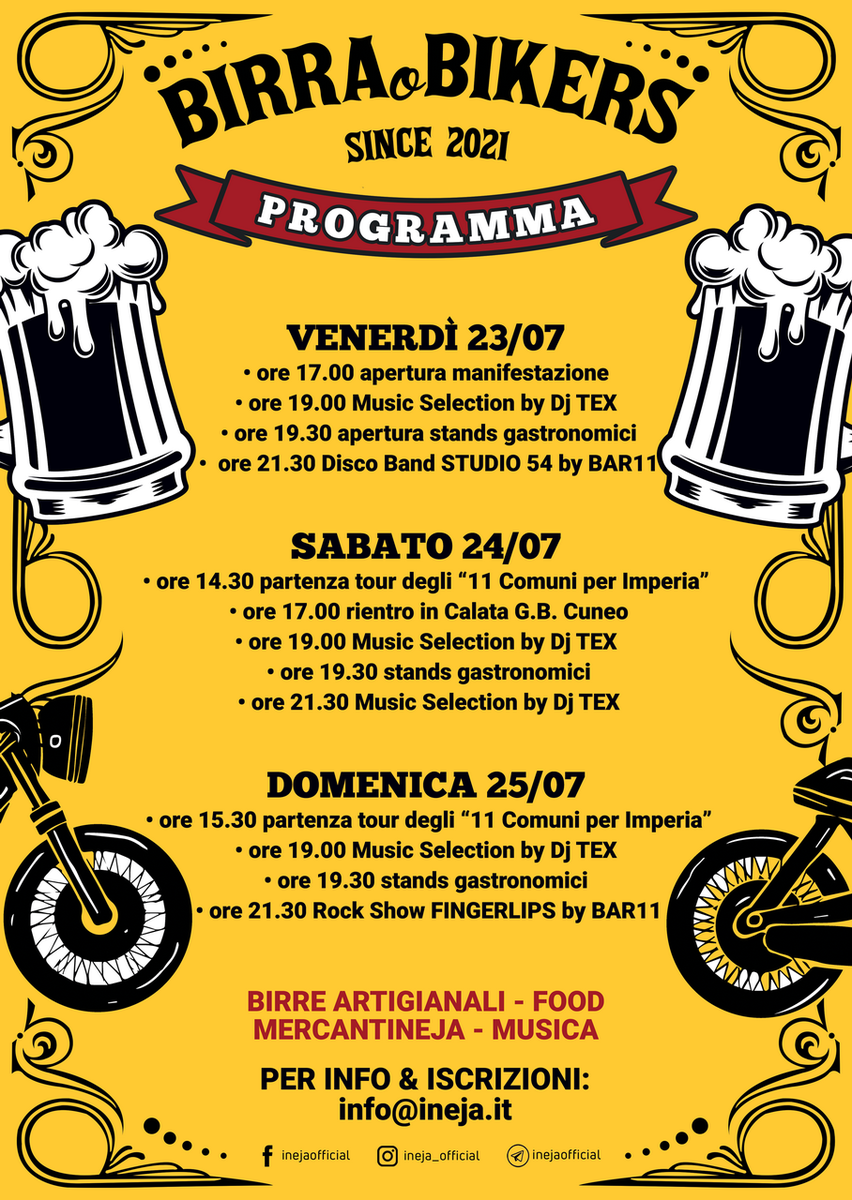 17.00. ‘Birra, Musica & Biker’: evento a cura del Comitato San Giovanni con Birre Artigianali, Food, Mercantineja, Musica. Banchina Aicardi, molo corto di Oneglia, fino al 25 luglio (la locandina)
