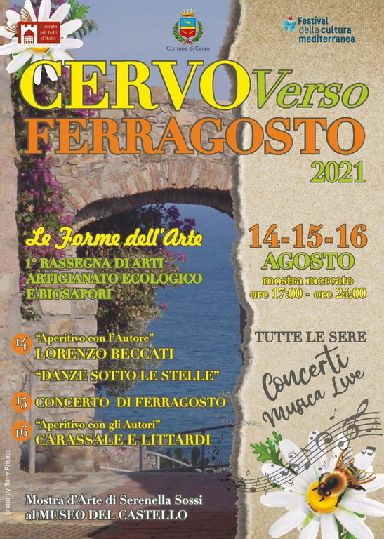 Il Comune di Cervo, in collaborazione con il Festival della cultura mediterranea di Imperia e l’associazione I Borghi più belli d’Italia organizza la rassegna Cervo verso Ferragosto, una tre giorni che si snoderà da sabato 14 a lunedì 16 agosto ricca di eventi, incontri, musica e arte tra le vie del borgo.