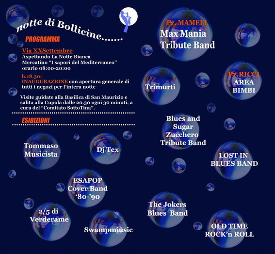 18.30. ‘La Notte Bianca’: inaugurazione con apertura generale di tutti i negozi per l'intera notte e con esibizione di numerose band. Via XX Settembre (locandina)