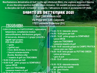 - 'Golf Inclusive Open Day': Manifestazione dimostrativa di Golf – Sabato, 25 settembre 2021 dalle ore 9.00 alle ore 18.30 presso il Golf Club Albisola ASD – Via Poggi, Loc. Carpineto – Albisola Superiore (SV).