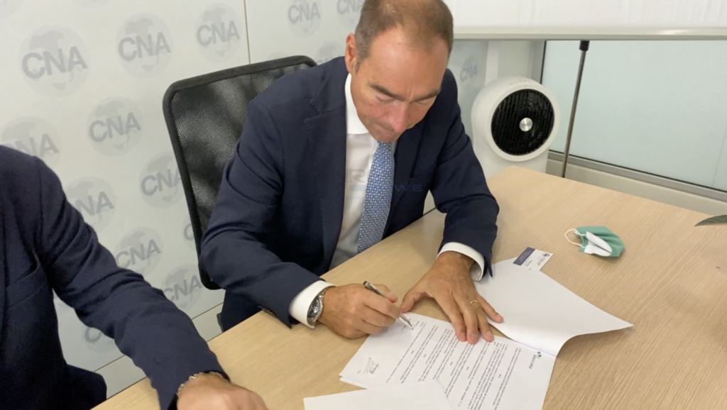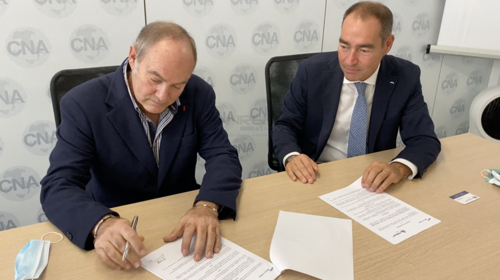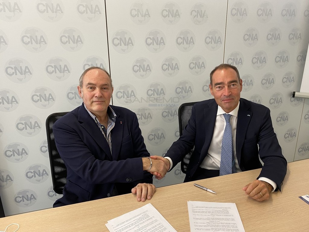 Michele Breccione, Presidente territoriale di CNA Imperia, e Gianluca Guaitani, chief commercial officer di Banca Carige seduti oggi fianco a fianco nelle sede sanremese di CNA per siglare un accordo di collaborazione, espressione della volontà di unire le forze per mettere in campo strumenti finanziari adeguati per sostenere l'attività e lo sviluppo delle aziende artigiane e delle piccole medie imprese che costituiscono l'ossatura portante dell'economia imperiese.