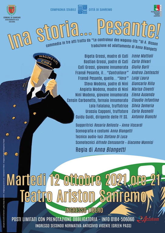 21.00. In occasione della festa patronale, la Compagnia Stabile Città di Sanremo presenta ‘Ina storia... pesante’: commedia di A. Bisson. Traduzione e adattamento di Anna Blangetti. Teatro Ariston, ingresso libero, necessario green pass