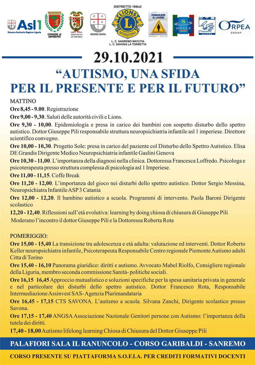 8.45-18.00. Convegno su ‘Autismo, una sfida per il presente e per il futuro’ con la partecipazione di numerosi relatori. Evento a cura del Distretto Lions 108ia3, Lions Club Sanremo Matutia e Lions Club Savona Torretta. Sala Ranuncolo del Palafiori in corso Garibaldi (la locandina con il programma a questo link)