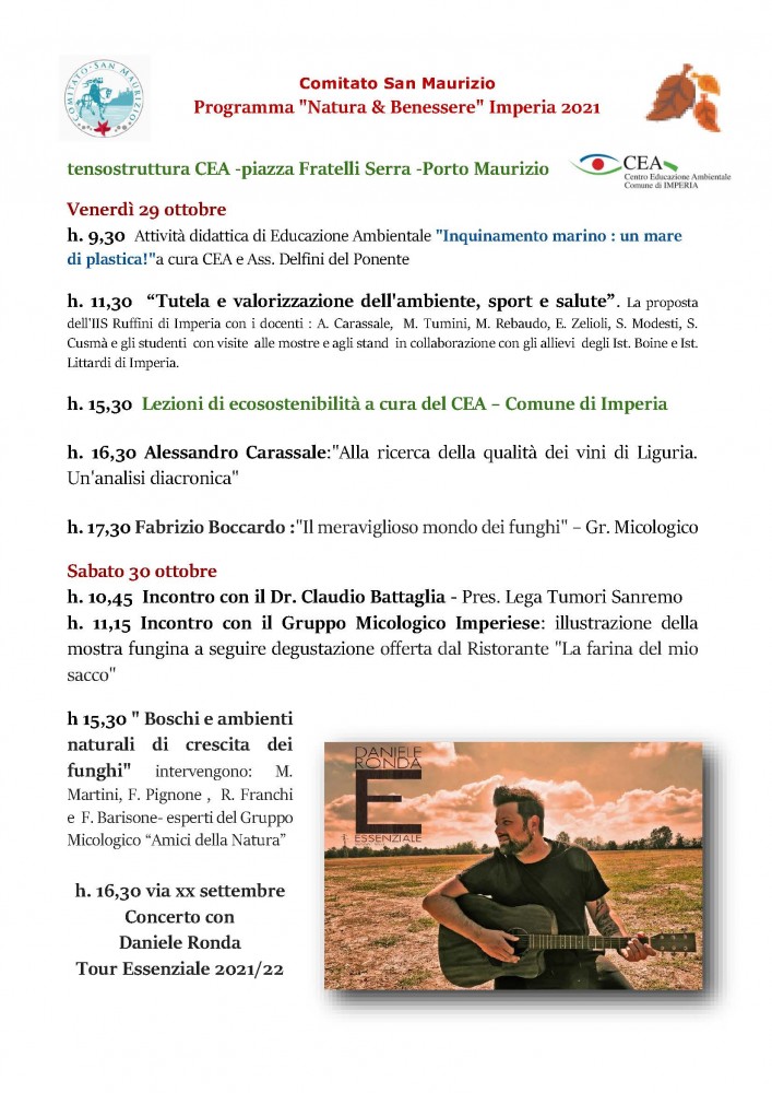 9.00-20.00. ‘Natura & Benessere 2021’: manifestazione culturale dedicata alla tutela ambientale e alla difesa del verde nel ponente ligure con mostra mercato in centro città. A cura del Comitato San Maurizio in collaborazione con Gruppo Micologico Imperiese. Special guest Max Laudadio. Tensostruttura del CEA in piazza Serra, fino al 31 ottobre (il programma a questo link)