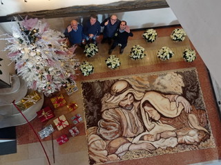 È visitabile da questa mattina, nell'atrio del Palazzo Comunale di Imperia, il presepe realizzato dalla Compagnia di Via Carducci. Si tratta di una Natività che, sfruttando la tecnica utilizzata per la storica Infiorata, riproduce un quadro attraverso l'utilizzo di diversi materiali: farina, polenta, bratta del caffè, segatura colorata e fiori secchi macinati. Accanto all'opera è presente un albero di Natale, realizzato dal fiorista e allestitore Sergio Alossi con il suo staff, sotto il quale sono presenti 11 pacchi dono, per richiamare gli undici ex Comuni che hanno formato la città di Imperia.
