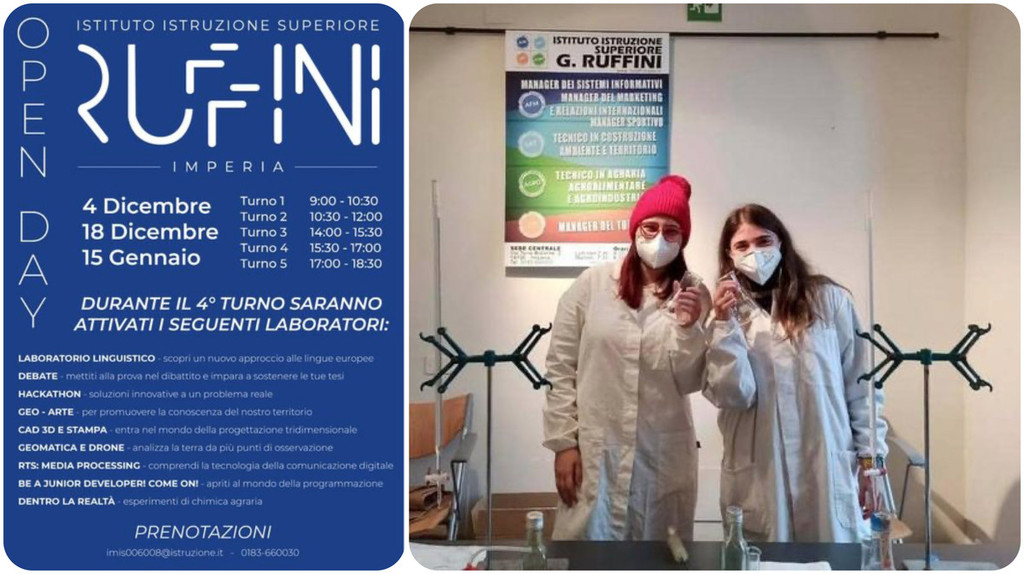 "Open day quindi strutturati in modo diverso con un’attenzione particolare alle diverse discipline tecniche delle quattro anime dell’Istituto Ruffini, con in aggiunta la messa in opera del saper fare e delle avanguardie educative che dimostrano come l’Istituto sia sempre aggiornato e attento all’evoluzione del mondo della didattica, del lavoro e della società. Nove diversi laboratori, tutti prenotabili tramite email all'indirizzo: imis006008@istruzione.it o tramite telefono al numero: 0183 660030, chiedendo dell'Ufficio alunni poiché per rispetto del protocollo anti covid, gli ingressi saranno contingentati e a numero chiuso" - ricordano dal Ruffini di Imperia.