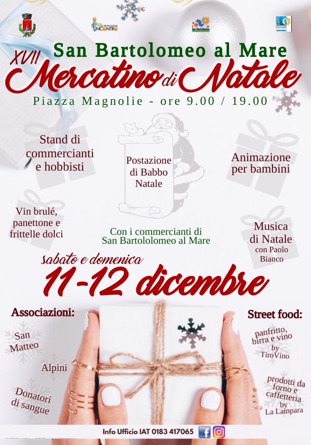 9.00-19.00. Tradizionale Mercatino di Natale: shopping natalizio con numerosi stand, bancarelle di hobbisti + degustazione di gustosi spuntini e prodotti da forno dolci e salati proposti + servizio caffetteria + intrattenimento musicale di Paolo Bianco + postazione di Babbo Natale + giochi e laboratori per i più piccoli. Piazza Magnolie (locandina)