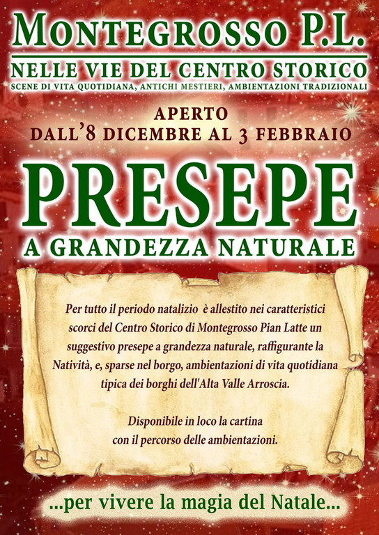 “Nei caratteristici scorci del centro storico di Montegrosso Pian Latte – si spiega nel comunicato - è stato allestito un suggestivo presepe a grandezza naturale, raffigurante la Natività, e, sparse nel borgo, ambientazioni di vita quotidiana tipica dei borghi rurali dell’Alta Valle Arroscia.