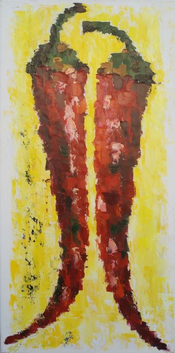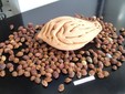 In esposizione assieme agli allegri e benaugurali peperoncini in gran formato come le zucche, i melograni, le mele, il carciofo e le eleganti bottiglie, anche la curiosa installazione dei noccioli di pesca, col gigantesco nocciolo in terra cotta.