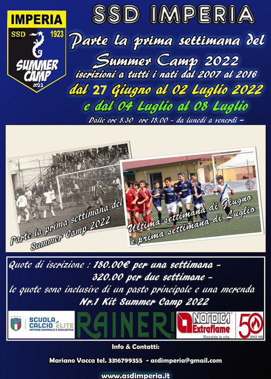 “La SSD Imperia - spiegano dalla società sportiva - sta portando numerosi iscritti alle due settimane che si svolgeranno nella struttura del campo Salvo di regione Perine ai Piani dal 27 giugno al 8 luglio 2022 dal lunedì al venerdì, con formula day-camp dalle 8.30 alle 18.00. Uno staff di istruttori professionisti e selezionati si dedicherà ai bambini iscritti (sono accettati dall'età di 6 a 14 anni) insegnando loro i principi tecnici con metodi improntati al divertimento e alla disciplina della palla rotonda. Ad essi sarà affiancato un servizio di animazione per la pausa tra le due sedute dopo il pranzo che farà divertire i ragazzi con musica e giochi. I partecipanti saranno dotati di un kit Summer Camp”.