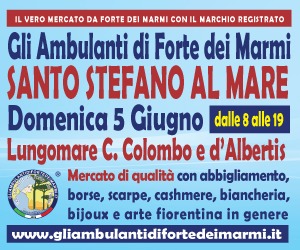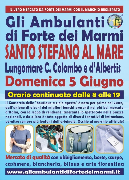 "Gli Ambulanti di Forte di Marmi”! Il mercato di qualità più famoso d’Italia torna a grandissima richiesta nell’Imperiese, con tutto il meglio del Made in Italy artigianale e le ultime tendenze della moda. Le ormai mitiche “boutique a cielo aperto” dell’originale Consorzio sono attese domenica 5 giugno a SANTO STEFANO AL MARE (Lungomare C. Colombo e d’Albertis). Dunque, un appuntamento da non perdere assolutamente per i tanti appassionati del genere, con una giornata che sarà come sempre all’insegna dello shopping più glamour e conveniente, con orario continuato, anche in caso di maltempo, dalle 8 alle 19.