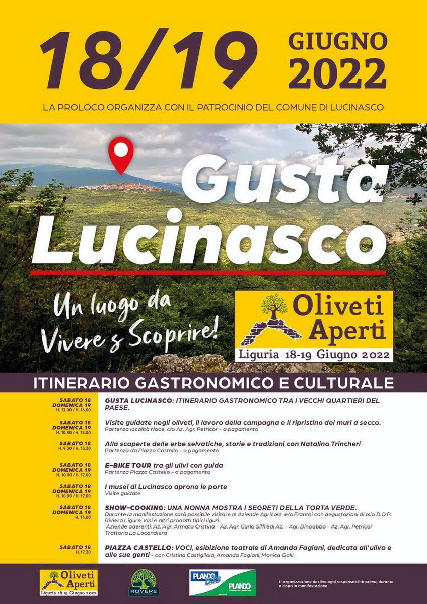 10.00-14.00. ‘Gusta Lucinasco’: percorso culturale ed enogastronomico che permetterà di scoprire e visitare il borgo + teatro, concerti, sagre, arte, prodotti tipici e escursioni sul territorio (locandina con gli orari)