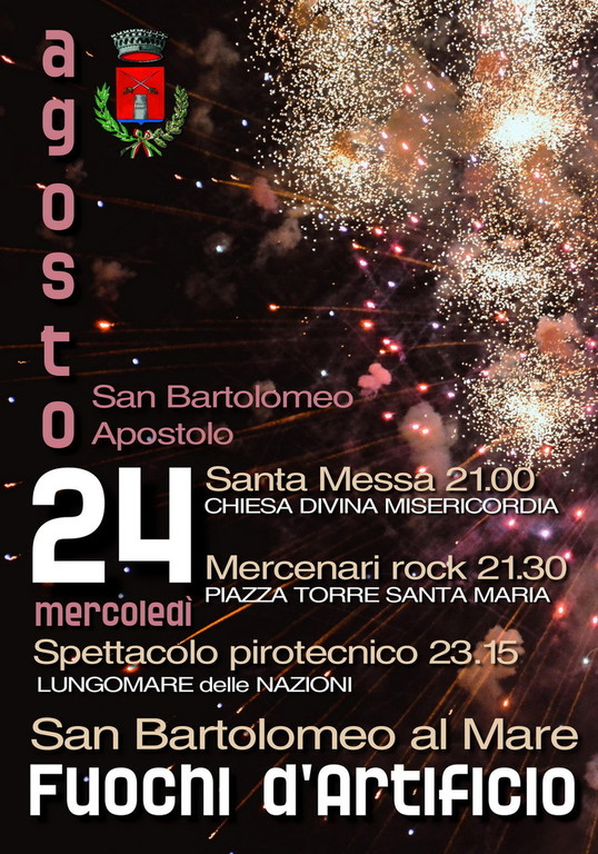 Mercoledì 24 agosto torneranno anche i tradizionali fuochi d'artificio sul Lungomare delle Nazioni, previsti per le ore 23.15. Prima dello spettacolo pirotecnico, in piazza Torre Santa Maria suoneranno i Mercenari Rock, cover band imperiese nota e apprezzata dal pubblico di tutta la provincia e non solo.