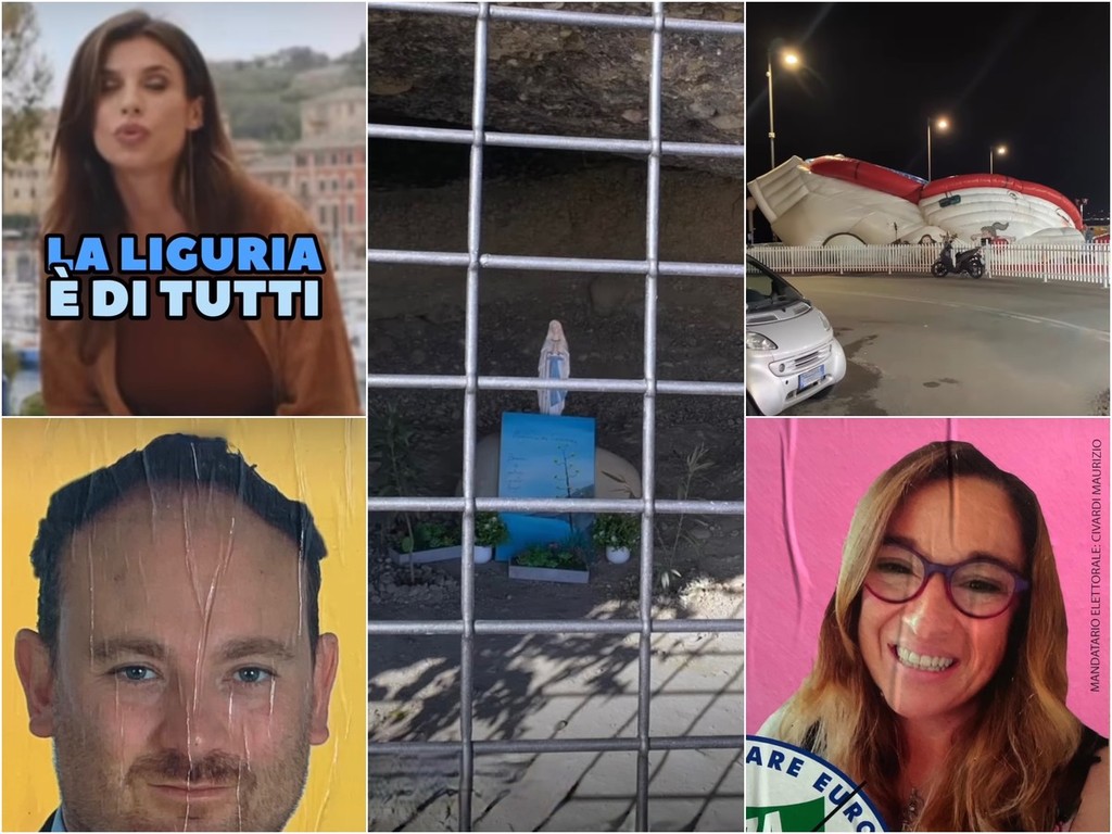C’è di tutto, tra orrori in salsa ligure, terrificanti cartelli, gonfiabili dal tema discutibile, testimonial esotici, Madonnina incarcerate e una campagna elettorale scontornata male.