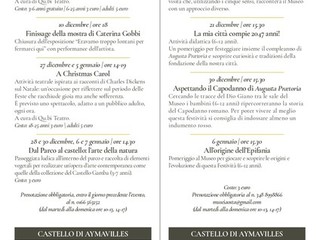 Dal canto loro il Castello Gamba e il castello di Aymavilles sapranno affascinare i propri ospiti con tante proposte per vivere il lato più artistico del Natale: dalle visite-gioco alle passeggiate, dai giochi tematici fino ad attività teatrali dedicate al Christmas Carol di Charles Dickens.