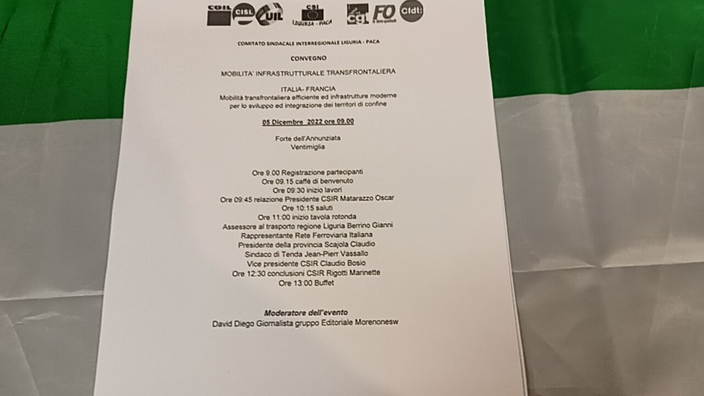 Abbiamo analizzato i tempi del convegno con molti dei partecipanti, tra questi il vice presidente Csir Claudio Bosio, che ha detto: “Lo scopo è quello di discutere come organizzazioni sindacali italiane e francesi, sulla mobilità e l’accessibilità del territorio, senza dimenticare il turismo, la terza età, la salute e agevolare l’efficientamento della mobilità tra costa ed entroterra, migliorando gli spostamenti dei lavoratori transfrontalieri. Crediamo che il territorio debba superare un isolamento storico, aggravato dopo la tempesta ‘Alex’ e che comunque sconta i problemi del binario unico, l’autostrada e l’Aurelia Bis che non sappiamo quando sarà terminata”.